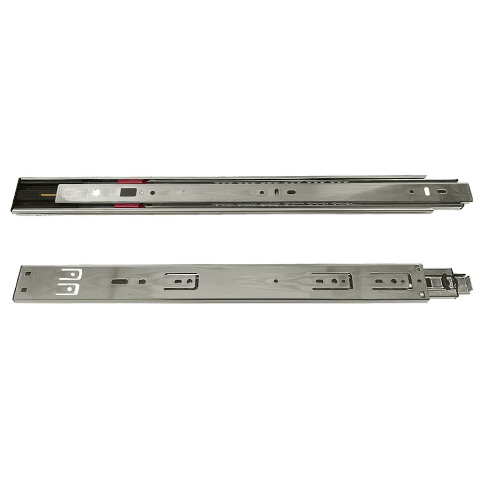 This side mount drawer slide set features a 100 pound load rating. Includes all screws necessary for installation. Two slides are included as a set sufficient for one drawer.